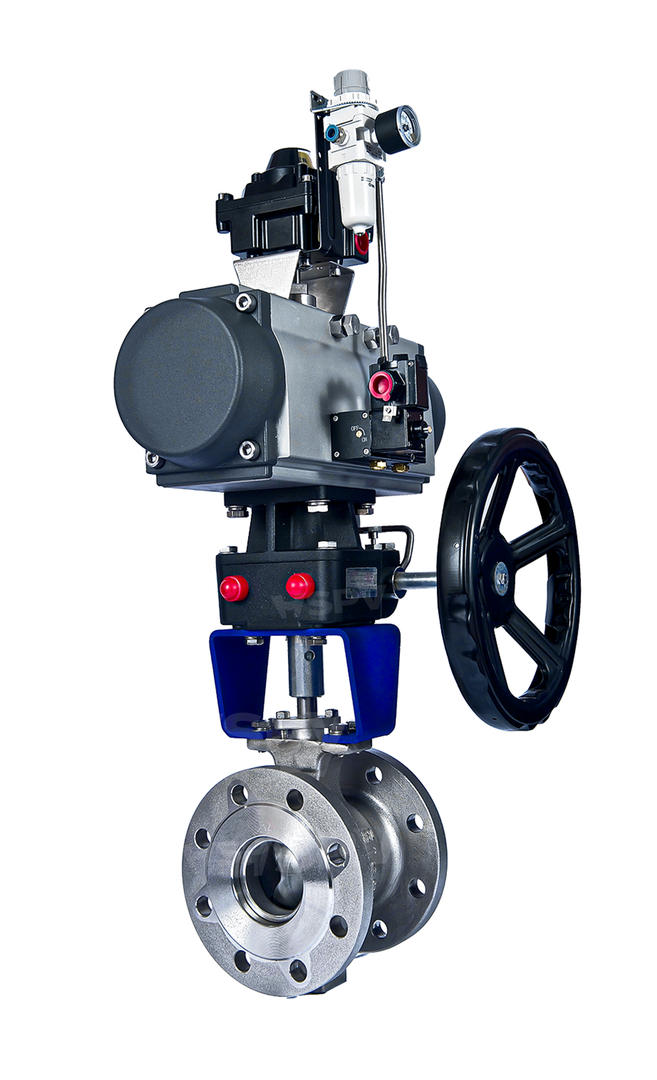 对夹 V 型球阀作为一种直角回转的高级控制阀,在行业中具有显著的优势。它的启闭件是带特殊 V 型开口的半球体,具有锋利的刃口。在球体回转过程中,密封面具有强有力的切断力和自清洁功能。球体的 V 型开口与阀座流道形成一个扇形区域,在回转过程中可改变流道面积,形成对介质的线性等比例精确调节。因此,对夹 V 型球阀同时具备调节和开关两种功能,能够满足各种复杂的工业流体控制需求。