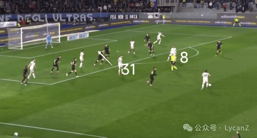 中卫三人组触球最少的都有94次,加上拖后梳理组织的莫德里奇同样有高达110次触球,米兰全场占据66%的控球率,从这一点看,主队比萨的压迫强度并不高,给米兰后场相对宽松的传球环境。